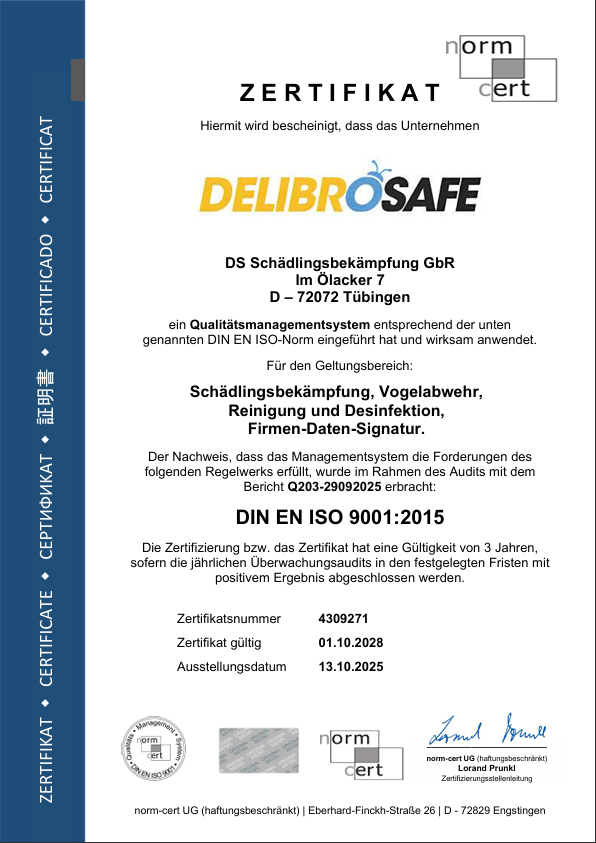 Willkommen bei Delibrosafe! Schützen Sie Ihr Unternehmen vor Schädlingen und setzen Sie auf unsere bewährte Expertise. Unser Ziel ist es, Ihnen eine maßgeschneiderte Lösung anzubieten, die Ihre spezifischen Anforderungen erfüllt und Ihren Betrieb schützt.